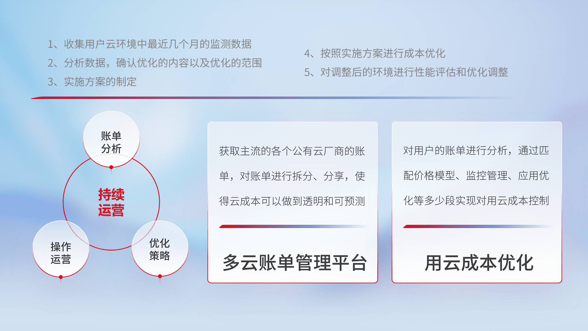通过多云纳管,,,,以统一的资源数据模型把客户的云资源进行抽象和封装,,进而实现对多云资源的统一操作,,保障云资源管理的可靠性、、稳定性与可用性。。量身定制化运维内容,,,配置、、开发运维、、补丁管理、、、备份、、、监控、、、、认证和访问管理、、审计和日常巡检等,,保障在用云过程中的可靠度,,,,稳定度以及高可用率。。。。